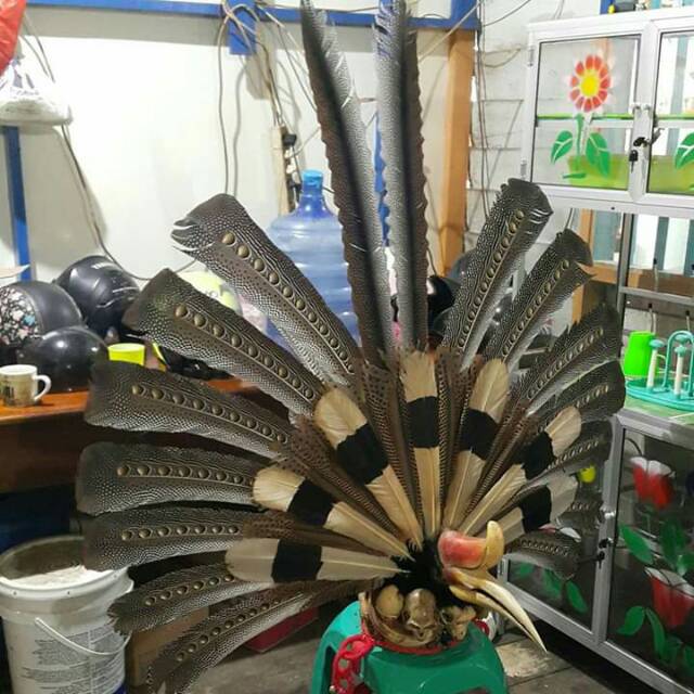 Topi adat dayak di penuhi dengan bulu ruai dayak kepala enggang fiber kalimantan tengkorak monyet fiber taring babi fiber bulu asli semua full set bulu burung ruai. Harga yg tertera adalah harga untuk 1 helai bulu (1 pcs).